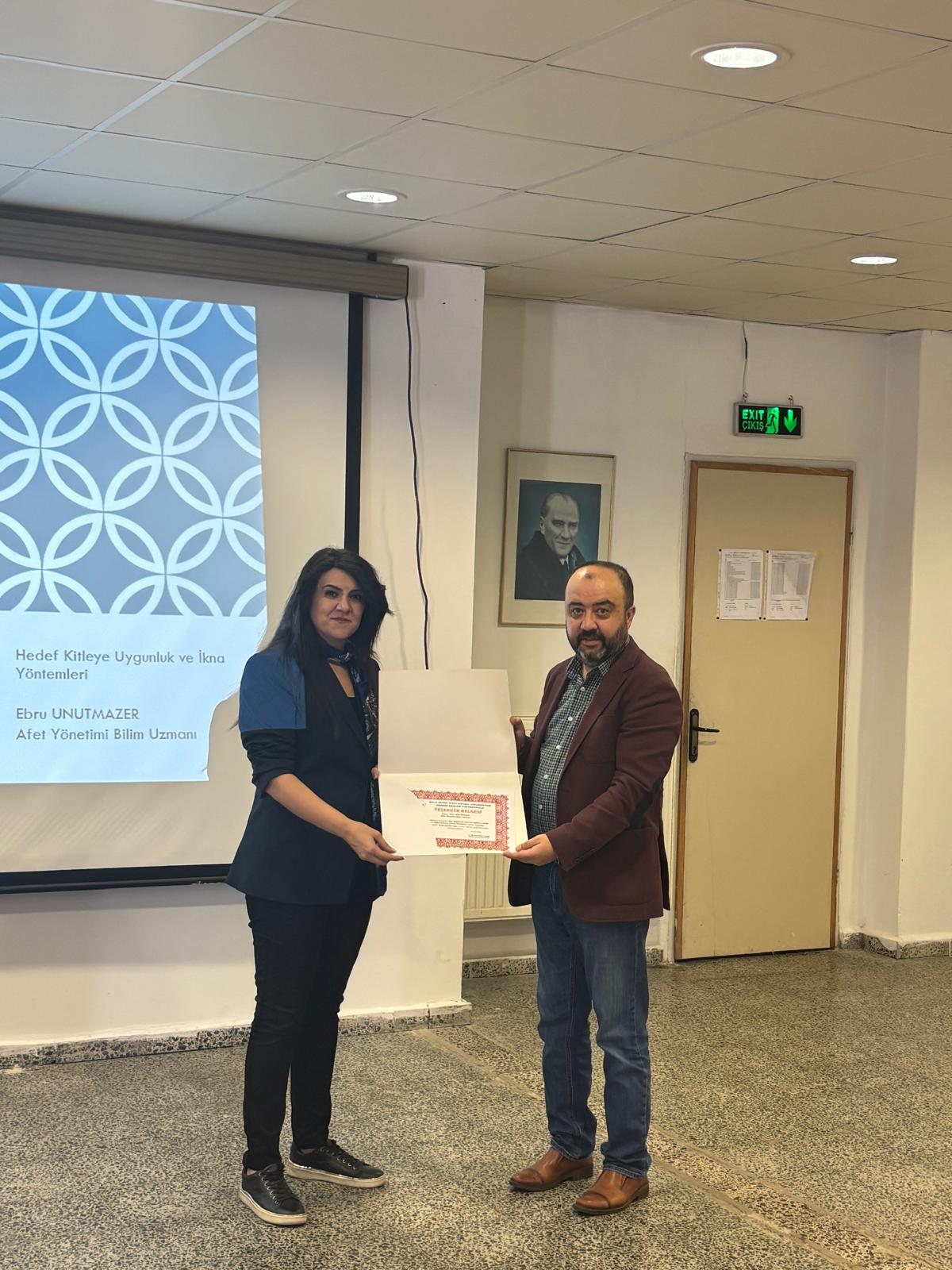 Mülkiyet Koruma ve Güvenlik Bölüm Başkanı Dr. Öğr. Üyesi Melike DÖRTER ve Öğr. Gör. Ramazan ÇALIŞIR’ın katılım sağladıkları etkinlik, Meslek Yüksekokulu Müdürümüz Dr. Öğr. Üyesi Hakan ÇAMBEL’in, Sayın UNUTMAZER’e teşekkür belgesi ve plaket takdim etmesiyle sona erdi.